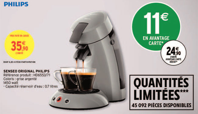 La promotion porte sur la machine Senseo Original de Philips et consiste à vous offrir un remboursement de 11€ sur votre carte fidélité. En caisse, vous paierez 35,90€ mais 11€ seront automatiquement crédités sur votre cagnotte Intermarché. Ainsi, en déduisant cette somme lors de vos prochaines courses, vous pourrez considérer que la machine à café Senseo Original vous aura coûté 24,90€ seulement.