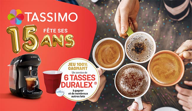 Tentez de gagner des tasses Duralex, une machine à café ou un bon de réduction au jeu Tassimo 15 ans