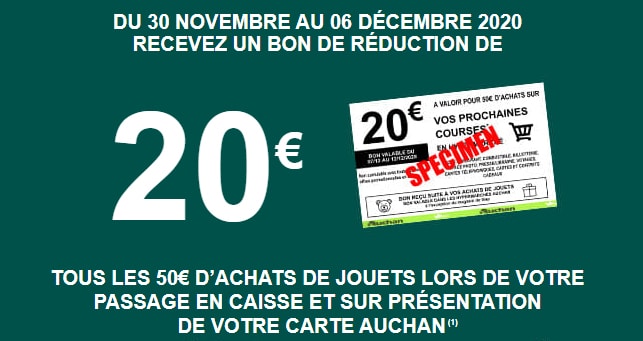 Afin d’inciter les familles à choisir les cadeaux de Noël dans les rayons de ses points de vente, elle organise une opération fidélité particulièrement sympathique ! En effet, du lundi 30 novembre au dimanche 6 décembre 2020, les hypermarchés Auchan vous offrent un bon de réduction de 20€ par tranche de 50€ d’achats au rayon jouets (hors consoles et jeux vidéo) et sur présentation de la carte de fidélité.