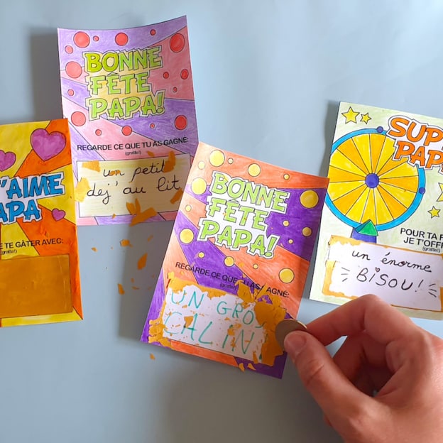 Ils prennent la forme de jolies cartes à imprimer et à colorier qui contiennent une case à personnaliser. A l’intérieur de ce petit cadre, le bambin peut inscrire la nature du cadeau qu’il souhaite offrir à son papa. Une fois, recouverte par le mélange spécial dont nous vous parlerons plus tard, il suffit au père de famille de gratter la case pour découvrir son véritable cadeau.